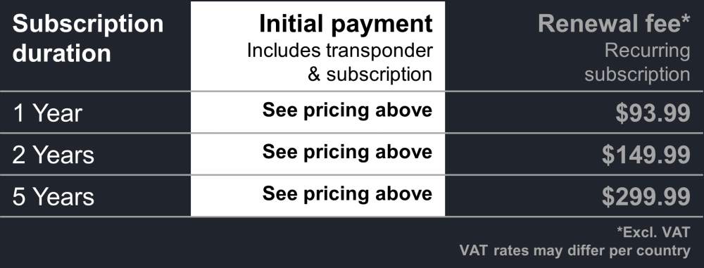 Unlimited warranty during active subscription (2 years warranty on TR2 Go Transponder)